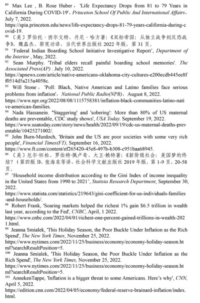 人均预期寿命大幅下降。美国疾病控制和预防中心下属全国健康状况统计中心2022年8月发布的报告显示,2019年至2021年,美国人均预期寿命下降了2.7岁,至76.1岁,降至1996年来新低。其中非拉美裔美洲印第安人、阿拉斯加原住民群体的人均预期寿命降幅最大,达到了惊人的6.6岁。(注107)在和平时期,人均预期寿命大幅下降是罕见的。美国疾病控制和预防中心发布的数据显示,截至2022年12月29日,美国累计新冠死亡病例超过108万人,其中2022年新冠死亡病例超过26万人。(注108)德国《世界报》2023年1月15日报道称,人均预期寿命或许是衡量一个国家生活质量有多好,甚至在某种程度上是衡量一个国家有多伟大的最重要标准,美国政客却对此讳莫如深。除新冠疫情外,造成美国人均预期寿命急剧下降的原因还包括药物滥用、枪支泛滥等。(注109)弗吉尼亚联邦大学、科罗拉多大学博尔德分校和城市研究所的学者在《英国医学杂志》上发表的共同研究指出,美国健康水平的不断恶化、死亡率高企以及对少数族裔的持续不公,很大程度上是长期政策选择和系统性种族主义的产物。因新冠疫情造成的大量死亡,不仅体现了美国对疫情大流行的政策选择和不当处理,也反映了几十年来导致美国健康水平恶化的根深蒂固的原因。(注110)